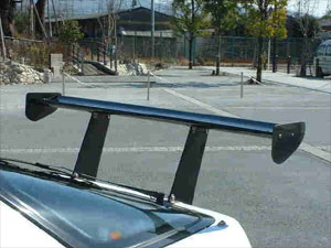 カ−ボン製ハイマウントGTウイング。高い位置、後方にウイングを設定する事により、リヤタイヤのトラクションの増大を実現し、高速走行時には絶大な安定感を得る事ができます。